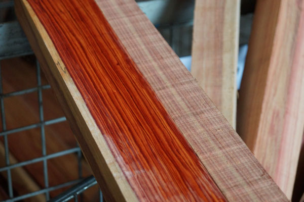 But how most of the strong coloured timber, also Red Heart looses the colour through UV irradiation and turns into pink.