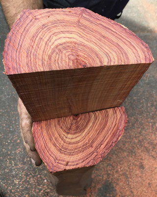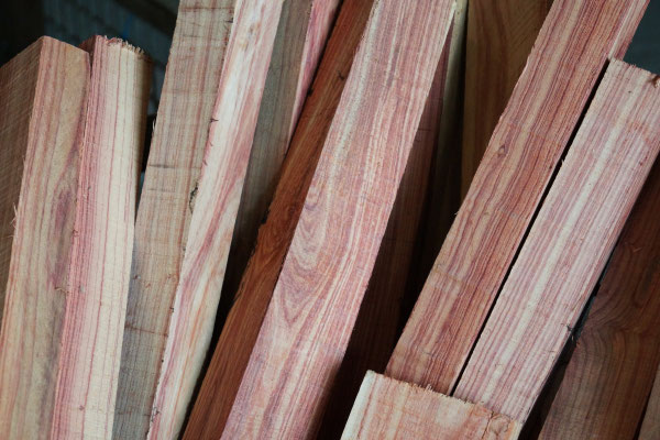 The heartwood of Brazilian Rosewood features a striking multi-colored striped grain, from purple-red to salmon-pink to rose-red. Older wood loses some of its color intensity, but it remains an exquisitely beautiful species. The grain is mostly alternating and irregular. The wood structure is medium-fine to fine. The wood has a pleasant mild smell, especially when worked, this pleasant rosy smell is noticeable.